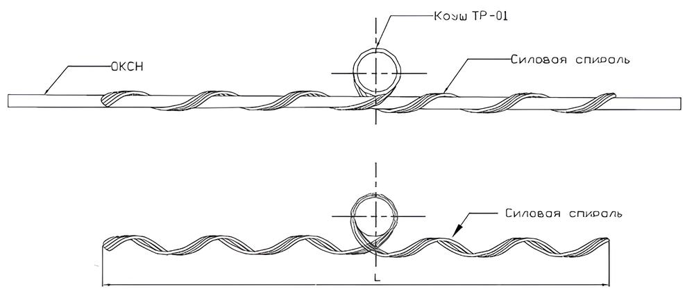 Зажим поддерживающий спиральный ПСО-50-4.9-5.6, без коуша - предназначен для подвески оптического кабеля на опоры ВЛ, контактной сети и автоблокировки ЖД, освещения, связи, городского транспорта, элементах зданий и сооружений с углами поворота трассы до 100 и длиной пролета до 50м включительно.